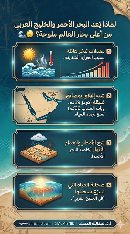 أوضح أستاذ المناخ بجامعة القصيم سابقًا الدكتور عبدالله المسند أن البحر الأحمر والخليج العربي من أكثر بحار العالم ملوحة بسبب اجتماع أربعة عوامل جغرافية ومناخية تجعل ملوحتهما استثنائية